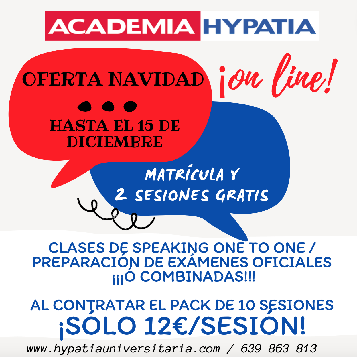 En el día de ayer estuvimos visitando las instalaciones de Academia Hypatia en la calle Isabel la Católica de Móstoles para hablar con su directora Irene Rodríguez Sánchez de la excelente oferta navideña de clases on line que tienen de cara a las navidades válida hasta el 15 de Diciembre Damos las gracias a Irene por dedicarnos su tiempo y atención Os vamos a contar en qué consiste la oferta, gracias a todo lo que nos ha contado Irene Estas navidades aprovecha para perfeccionar tus conocimientos en inglés , gracias a la irresistible oferta que nos tienen preparada estos profesionales expertos en formación De cara a Navidad sacar dos packs on line , realizados a través de su web: www.hypatiauniversitaria.com Estos pack son de diez sesiones y hay dos modalidades diferentes: Uno de speaking, llamado también one to one y, un segundo de grammar, reading y listening , además de writing que se dará a elección del alumno que contrate las diez sesiones. La oferta sería contratando las diez clases, que son de 45 minutos, se regalan dos clases más y no se cobra matrícula Cada clase sale a 12 € Tienen esas dos opciones a elegir La oferta va a estar disponible hasta el 15 de Diciembre Se puede contratar en cualquier parte de España al ser on line Se pueden combinar las dos modalidades y preparar con ellas los exámenes oficiales En Academia Hypatia preparan exámenes oficiales de Cambridge, Oxford, Aptis y Toefl Pueden contratar los cursos de dos maneras: Llamando a los teléfonos 912386060 y 639863813 , o bien a través de la web También pueden escribir un mail a info@hypatiauniversitaria.com Es ideal como regalo de Navidad. Para losnque lo quieran regalar les harán un bono o tarjeta regalo imprimible y nominal para la persona a la que se le quiera regalar conocimiento Nunca está de mas formarse en idiomas y mejorar el futuro profesional