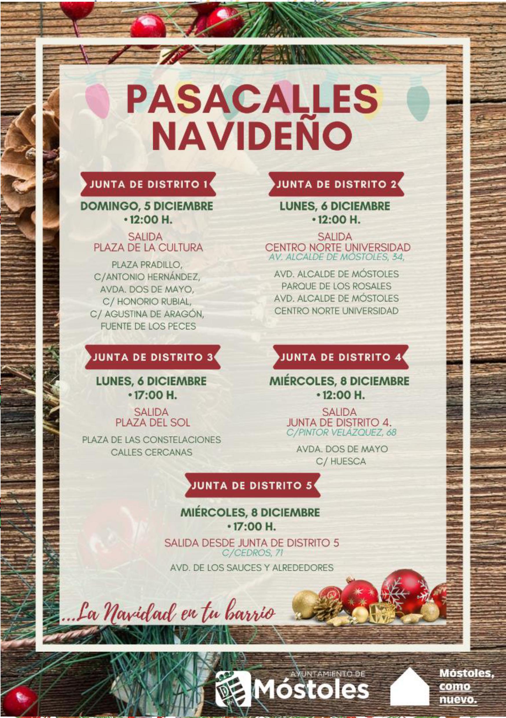 El próximo viernes 3 de diciembre a las 19:00 h. se procederá al encendido de la iluminación ornamental de Navidad. Previamente, la Banda Municipal Juvenil y Majorettes de Móstoles, junto a grupos de animación, harán un recorrido por las calles para llegar hasta la Glorieta de Cuatro Caminos, donde se encenderá el tradicional árbol de Navidad de casi 20 m de altura. Toda la iluminación de la ciudad, cerca de 1,4 millones de luces, serán de bajo consumo.